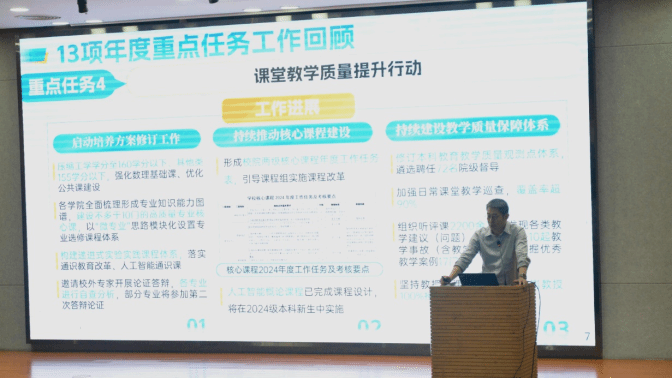 副院长万波汇报了学院本科人才培养方案修订工作,他谈到,在本科教学研讨月活动开展了10余场人才培养研讨凝聚全院共识,通过高校调研、企业同行专家研讨、校友及学生代表研讨等分析了当前培养方案存在的问题,提出了修订总体思路,并汇报了修订后的计算机科学与技术和软件工程专业培养方案的基本情况、课程模块、课程分布及变化等情况,对后续培养方案落实中涉及的课程建设、教材建设、团队建设和AI赋能进行了说明。他希望更多的老师积极投入到学院课程建设和课程教学改革中,共同提高教学质量和人才培养质量。