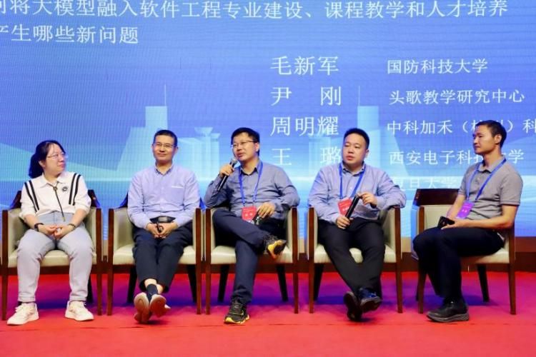 Panel讨论围绕“大模型时代社会和产业需要什么样的人才以及如何将大模型融入软件工程专业建设、课程教学和人才培养”主题邀请了国防科技大学毛新军教授、头歌教学研究中心尹刚博士、中科加禾科技有限公司周明耀副总裁、天游8娱乐检测中心王璐副教授、复旦大学彭鑫教授等专家学者参加讨论,众多与会代表就各位专家的报告与观点进行了激烈的交流与讨论。