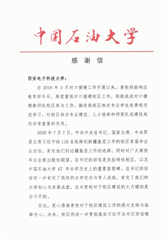 (通讯员 陈龙)为响应教育部号召,对口援建中国石油大学(北京)克拉玛依分校,2018年9月,天游ty8线路检测中心网址选派教学科研经验丰富的牛海军教授前往中国石油大学(北京)克拉玛依分校援建三年,牛海军教授勇于担当、甘于奉献,在援建期间,工作兢兢业业、任劳任怨、无私奉献,开展了大量卓有成效的工作,得到了学校领导、同事和学生们的认可。中国石油大学(北京)克拉玛依分校为表达感谢,专门致电学校,对天游线路官网及牛海军教授表示感谢。